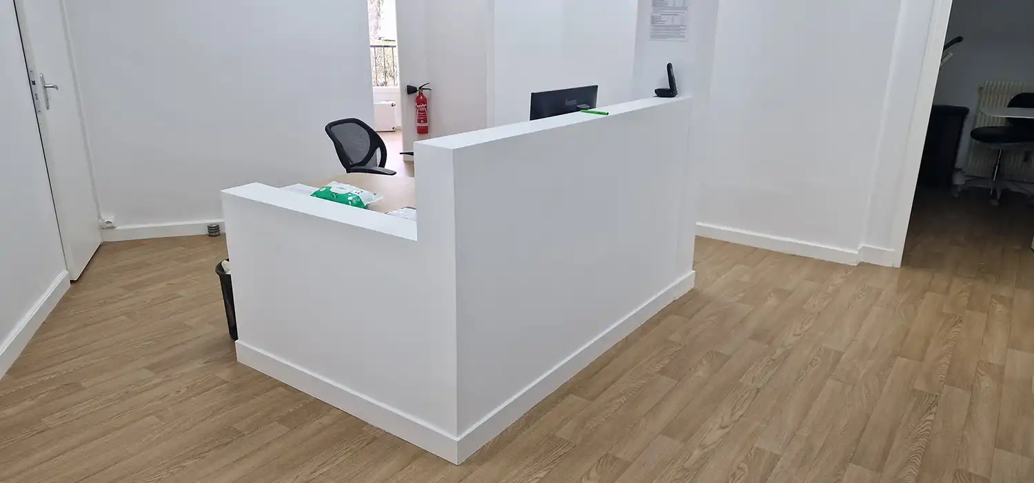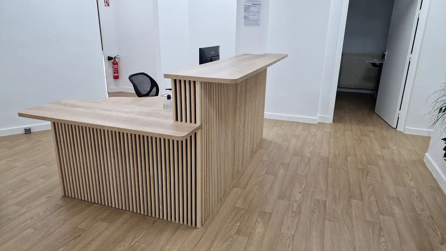Conception de banques d’accueil sur mesure, sobres ou originales, avec finitions bois, laquées ou texturées.